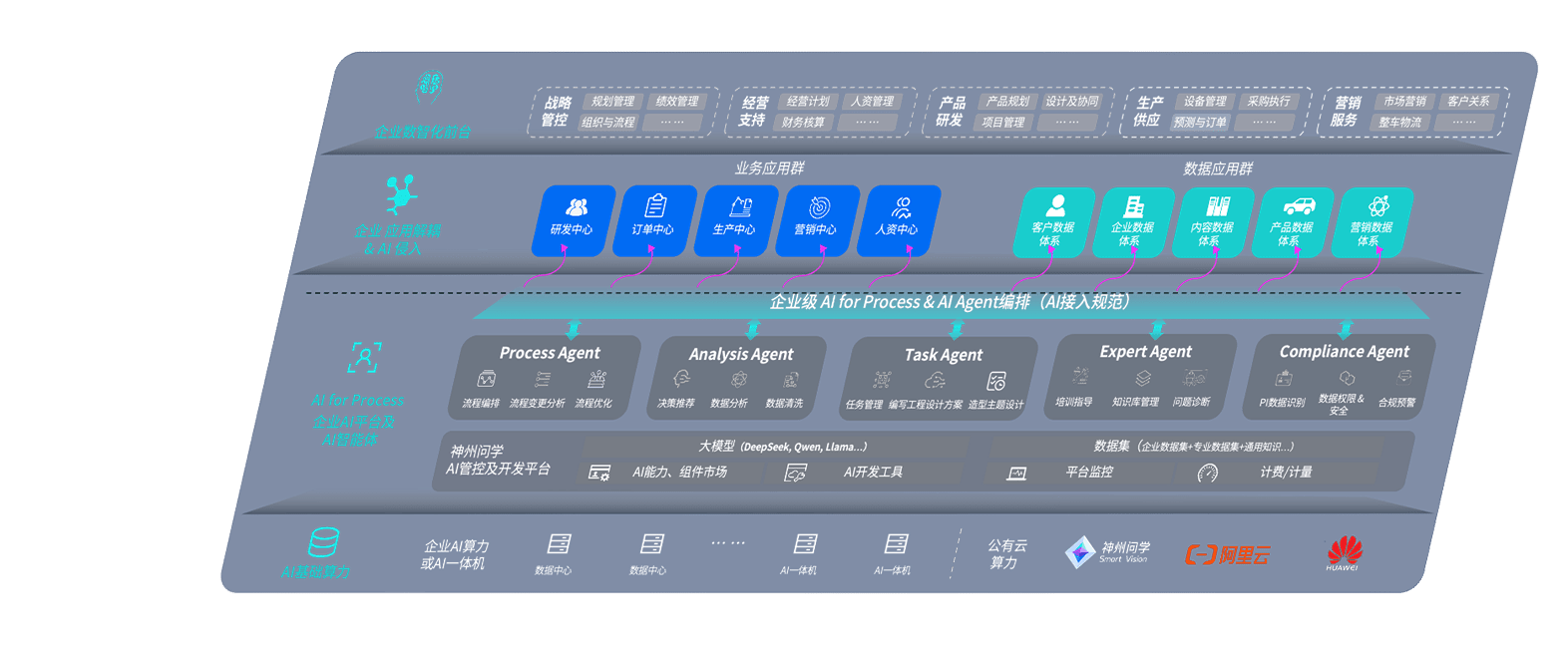 端到端的一站式AI工作空间深度融合了从企业战略规划到日常经营的全流程业务板块,,定向解决车企内部领域多、、部门多、、、、链条长、、场景碎片化等难题,,,,支持车企快速构建以AI为核心的生产力写作体系,,实现任务执行与AI能力的无缝集成与交互