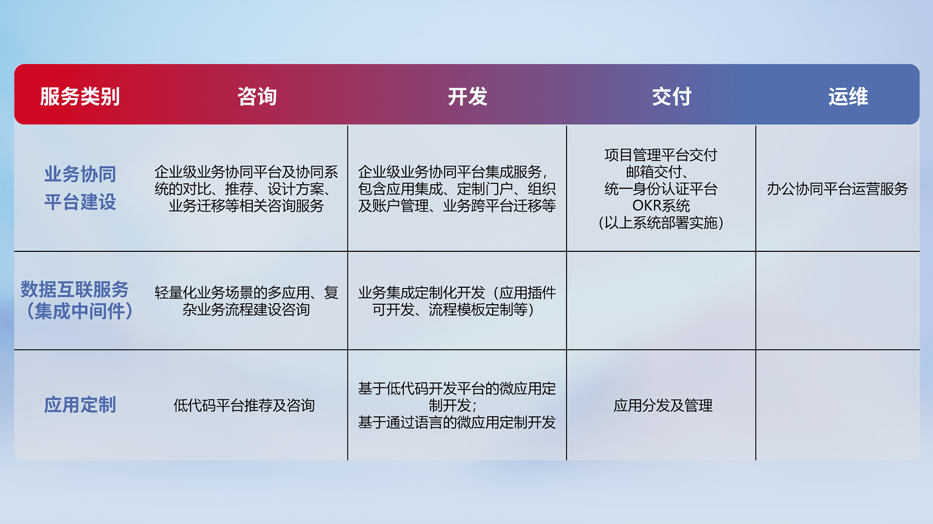 针对钉钉、、、企微、、、、IDaas等平台级产品提供产品的规划、、、、方案、、、、交付、、、定制化开发等服务,,实现如统一协同办公、、智能客户服务、、混合会议管理、、、智能数据查询、、、等业务场景,,,实现数字化转型。。。